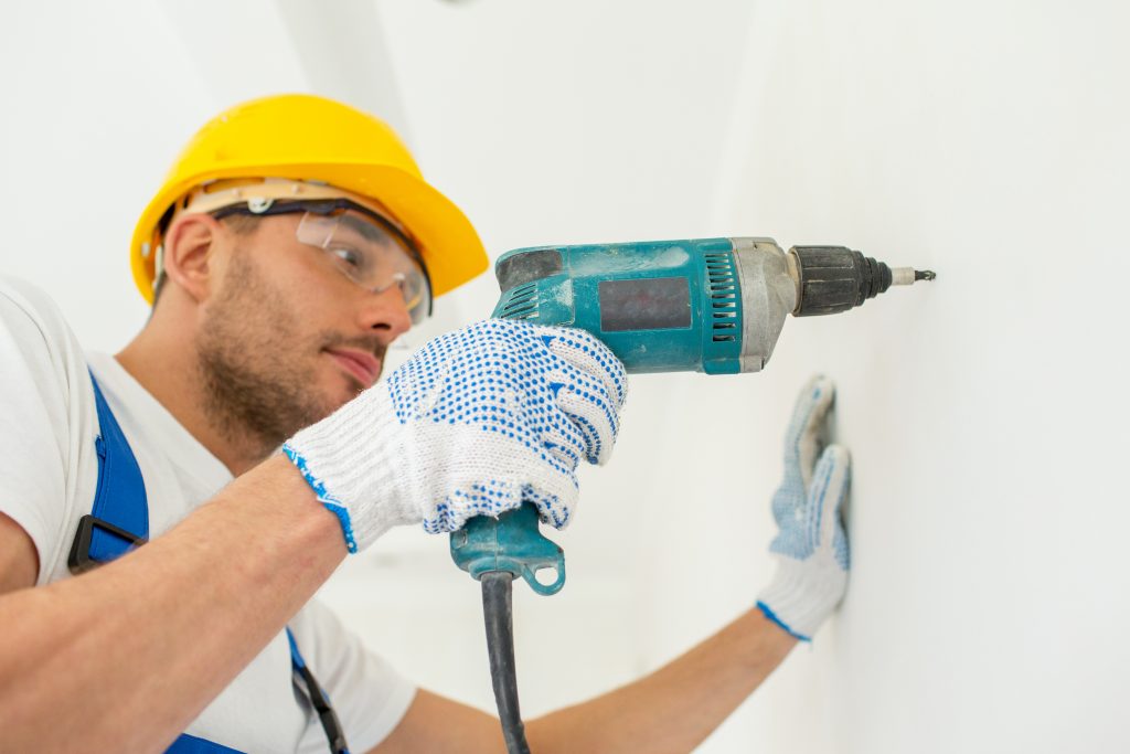 building, working equipment and people concept - close up of builder in hardhat perforating wall with drill indoors